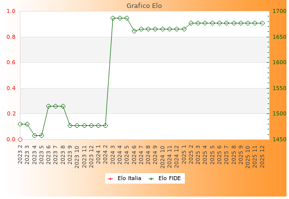 Elo FIDE: 1677    Migliore: 1686  (Maggio 2024)    Peggiore: 1458  (Aprile 2023)