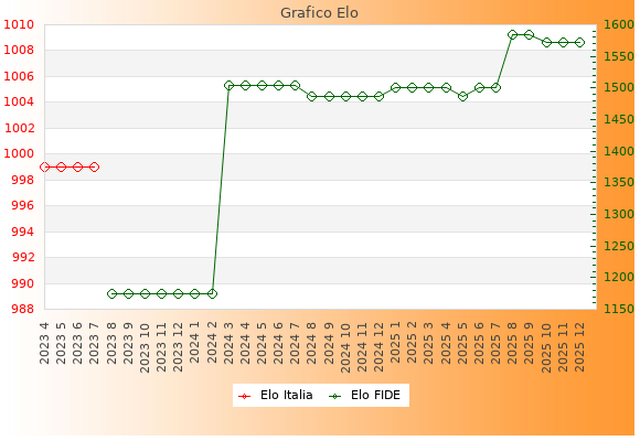Elo FIDE: 1572    Migliore: 1584  (Settembre 2025)    Peggiore: 1174  (Agosto 2023)