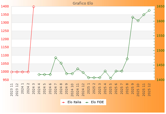 Elo FIDE: 1636    Migliore: 1636  (Dicembre 2025)    Peggiore: 1406  (Maggio 2025)