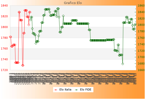 Elo FIDE: 1803    Migliore: 1851  (Dicembre 2014)    Peggiore: 1679  (Febbraio 2024)
