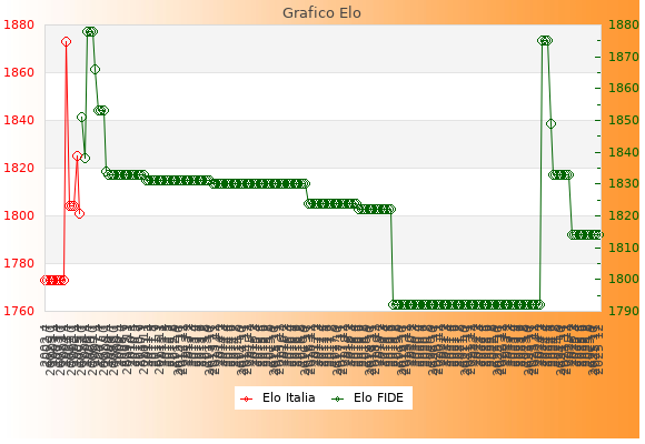 Elo FIDE: 1814    Migliore: 1878  (Ottobre 2006)    Peggiore: 1792  (Luglio 2019)