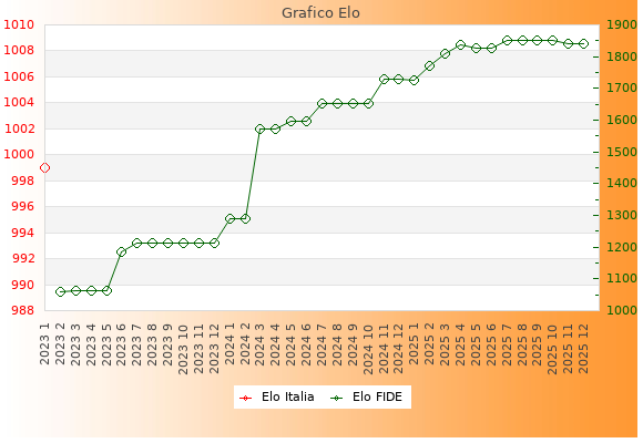 Elo FIDE: 1842    Migliore: 1851  (Ottobre 2025)    Peggiore: 1061  (Febbraio 2023)