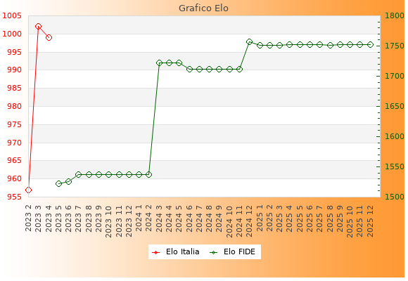 Elo FIDE: 1752    Migliore: 1757  (Dicembre 2024)    Peggiore: 1522  (Maggio 2023)