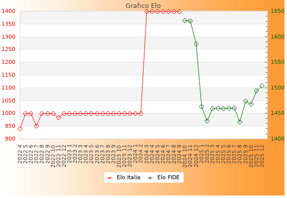 Elo FIDE: 1504    Migliore: 1632  (Ottobre 2024)    Peggiore: 1433  (Agosto 2025)