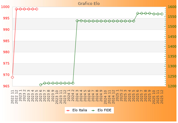 Elo FIDE: 1564    Migliore: 1568  (Settembre 2025)    Peggiore: 1208  (Giugno 2023)