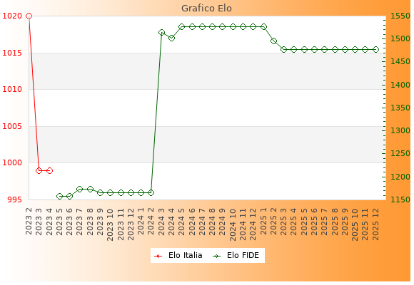 Elo FIDE: 1477    Migliore: 1526  (Gennaio 2025)    Peggiore: 1158  (Maggio 2023)