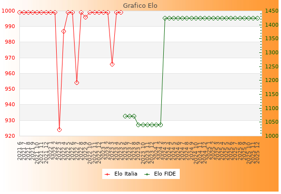 Elo FIDE: 1423    Migliore: 1424  (Aprile 2024)    Peggiore: 1040  (Settembre 2023)