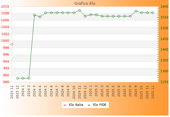 Elo FIDE: 1572    Migliore: 1583  (Novembre 2024)    Peggiore: 1267  (Dicembre 2023)