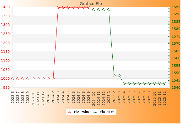 Elo FIDE: 1543    Migliore: 1593  (Gennaio 2025)    Peggiore: 1543  (Aprile 2025)