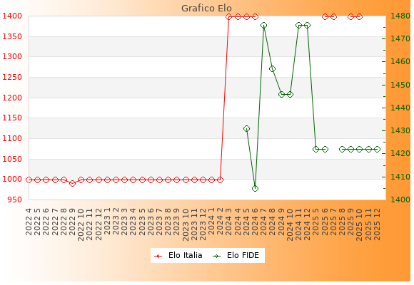 Elo FIDE: 1422    Migliore: 1476  (Dicembre 2024)    Peggiore: 1405  (Giugno 2024)
