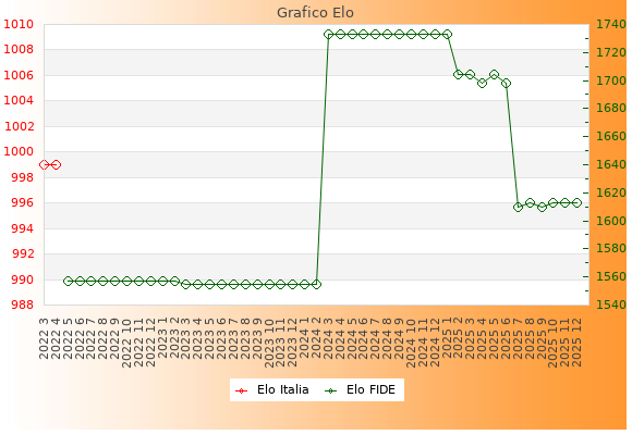Elo FIDE: 1613    Migliore: 1733  (Gennaio 2025)    Peggiore: 1555  (Marzo 2023)