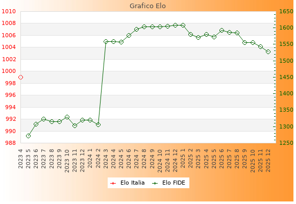 Elo FIDE: 1527    Migliore: 1608  (Gennaio 2025)    Peggiore: 1271  (Maggio 2023)
