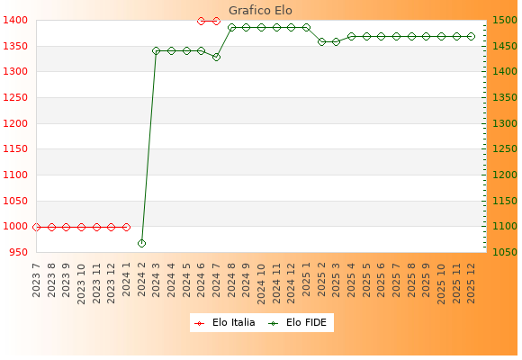 Elo FIDE: 1469    Migliore: 1486  (Gennaio 2025)    Peggiore: 1068  (Febbraio 2024)