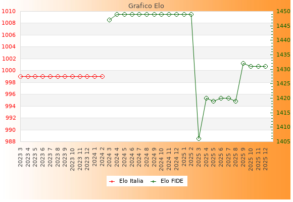 Elo FIDE: 1431    Migliore: 1449  (Febbraio 2025)    Peggiore: 1406  (Marzo 2025)