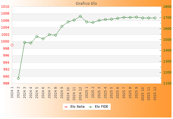 Elo FIDE: 1697    Migliore: 1712  (Dicembre 2024)    Peggiore: 1147  (Febbraio 2024)