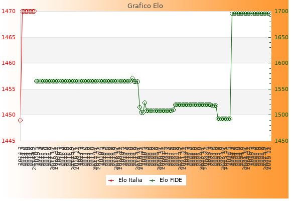 Elo FIDE: 1584    Migliore: 1627  (Febbraio 2025)    Peggiore: 1209  (Marzo 2023)