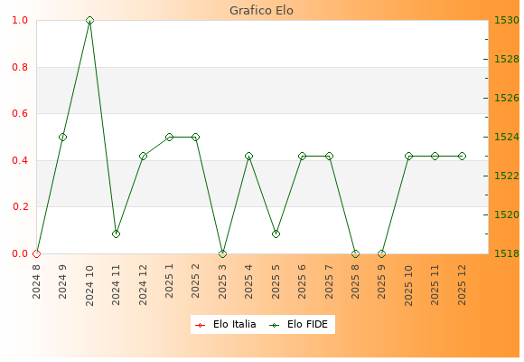 Elo FIDE: 1523    Migliore: 1530  (Ottobre 2024)    Peggiore: 1518  (Agosto 2024)