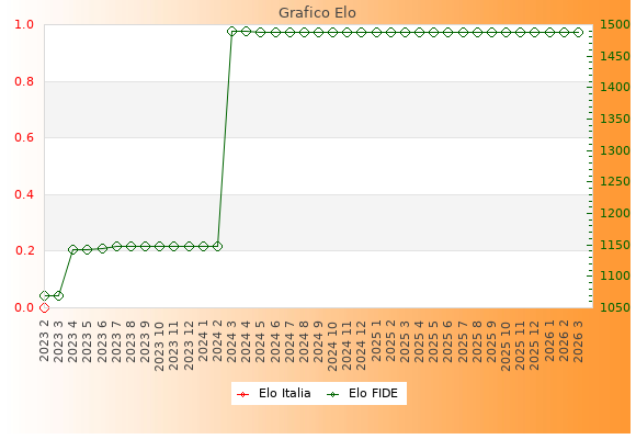 Elo FIDE: 1488    Migliore: 1489  (Aprile 2024)    Peggiore: 1069  (Febbraio 2023)