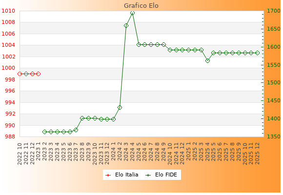 Elo FIDE: 1583    Migliore: 1695  (Aprile 2024)    Peggiore: 1364  (Febbraio 2023)