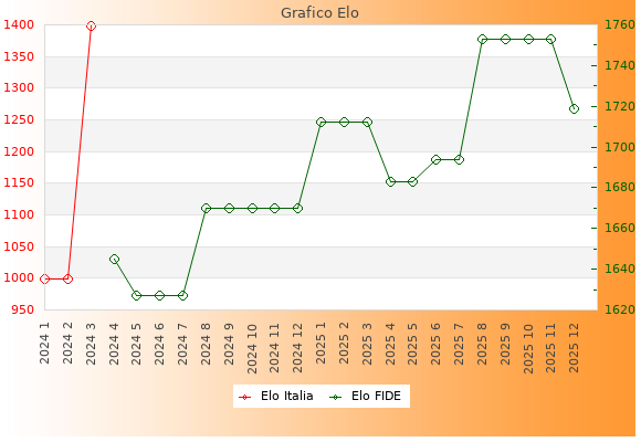 Elo FIDE: 1719    Migliore: 1753  (Novembre 2025)    Peggiore: 1627  (Maggio 2024)