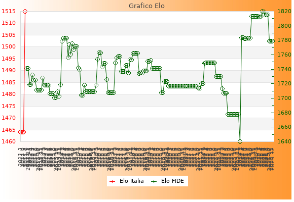 Elo FIDE: 1779    Migliore: 1820  (Maggio 2025)    Peggiore: 1640  (Febbraio 2024)