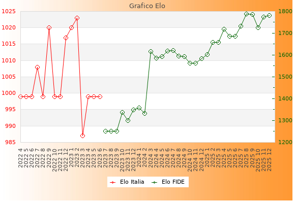 Elo FIDE: 1781    Migliore: 1789  (Agosto 2025)    Peggiore: 1250  (Luglio 2023)
