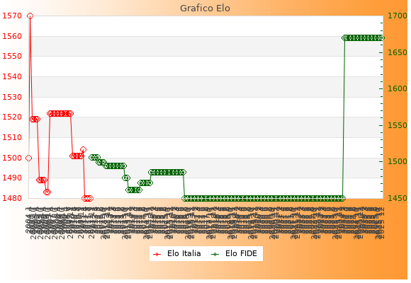 Elo FIDE: 1670    Migliore: 1670  (Dicembre 2025)    Peggiore: 1450  (Agosto 2016)