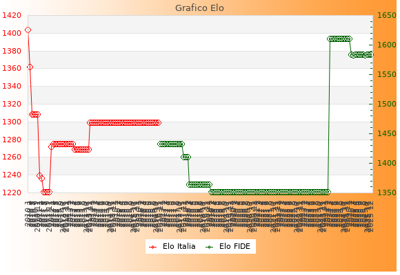 Elo FIDE: 1584    Migliore: 1611  (Gennaio 2025)    Peggiore: 1351  (Febbraio 2019)