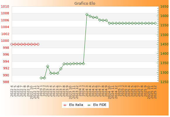 Elo FIDE: 1561    Migliore: 1608  (Marzo 2024)    Peggiore: 1272  (Gennaio 2023)