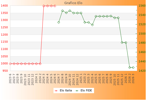 Elo FIDE: 1427    Migliore: 1549  (Ottobre 2024)    Peggiore: 1427  (Febbraio 2026)