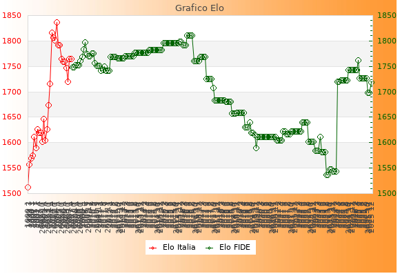Elo FIDE: 1718    Migliore: 1810  (Agosto 2016)    Peggiore: 1537  (Agosto 2023)