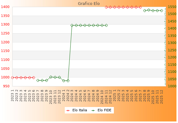 Elo FIDE: 1525    Migliore: 1528  (Settembre 2025)    Peggiore: 1038  (Gennaio 2024)