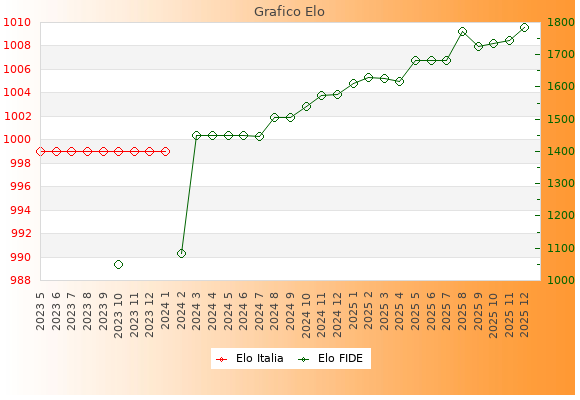 Elo FIDE: 1784    Migliore: 1784  (Dicembre 2025)    Peggiore: 1050  (Ottobre 2023)