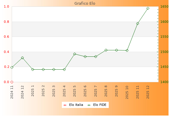 Elo FIDE: 1644    Migliore: 1644  (Dicembre 2025)    Peggiore: 1442  (Gennaio 2025)