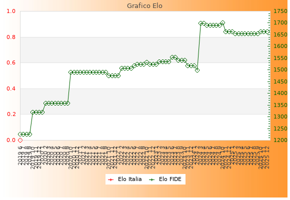 Elo FIDE: 1663    Migliore: 1701  (Ottobre 2024)    Peggiore: 1225  (Giugno 2019)