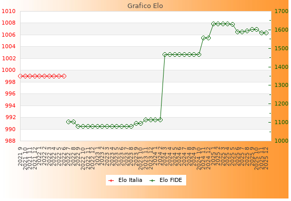 Elo FIDE: 1583    Migliore: 1633  (Aprile 2025)    Peggiore: 1078  (Settembre 2022)