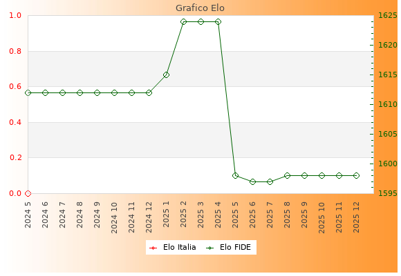 Elo FIDE: 1598    Migliore: 1624  (Aprile 2025)    Peggiore: 1597  (Giugno 2025)