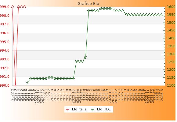 Elo FIDE: 1549    Migliore: 1590  (Ottobre 2024)    Peggiore: 1120  (Luglio 2022)