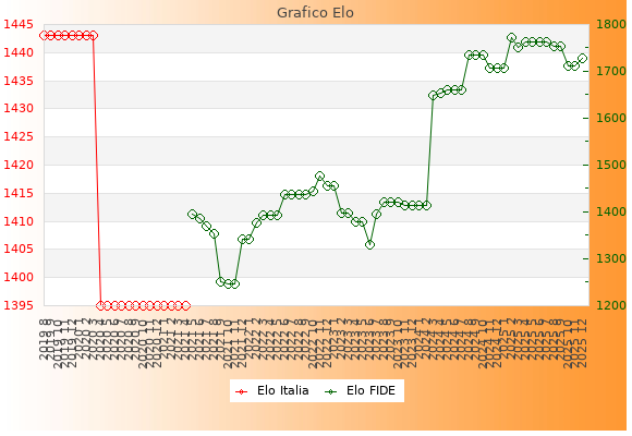 Elo FIDE: 1728    Migliore: 1771  (Febbraio 2025)    Peggiore: 1247  (Ottobre 2021)