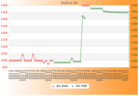 Elo FIDE: 1444    Migliore: 1475  (Dicembre 2024)    Peggiore: 1038  (Febbraio 2023)