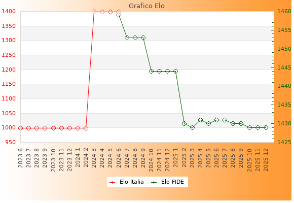 Elo FIDE: 1429    Migliore: 1459  (Giugno 2024)    Peggiore: 1429  (Marzo 2025)