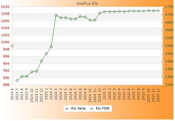 Elo FIDE: 1724    Migliore: 1724  (Dicembre 2025)    Peggiore: 1278  (Luglio 2023)