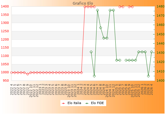 Elo FIDE: 1431    Migliore: 1476  (Dicembre 2024)    Peggiore: 1405  (Giugno 2024)