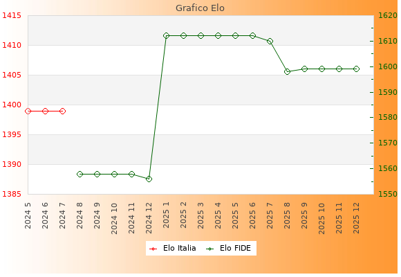 Elo FIDE: 1599    Migliore: 1612  (Giugno 2025)    Peggiore: 1556  (Dicembre 2024)