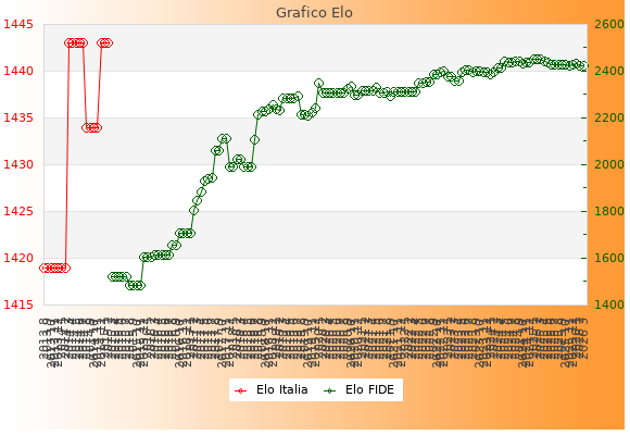 Elo FIDE: 2425    Migliore: 2453  (Gennaio 2025)    Peggiore: 1485  (Agosto 2015)