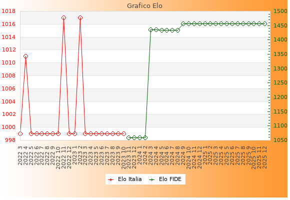 Elo FIDE: 1456    Migliore: 1457  (Dicembre 2024)    Peggiore: 1058  (Novembre 2023)