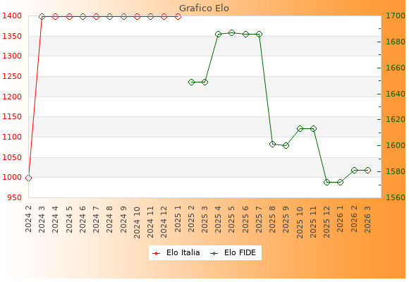 Elo FIDE: 1581    Migliore: 1687  (Maggio 2025)    Peggiore: 1572  (Dicembre 2025)
