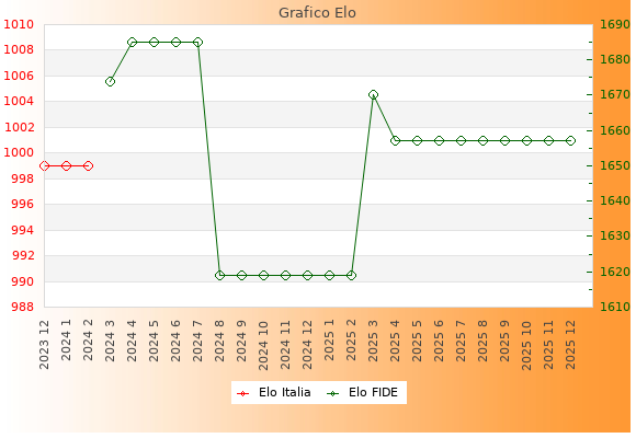 Elo FIDE: 1657    Migliore: 1685  (Luglio 2024)    Peggiore: 1619  (Agosto 2024)