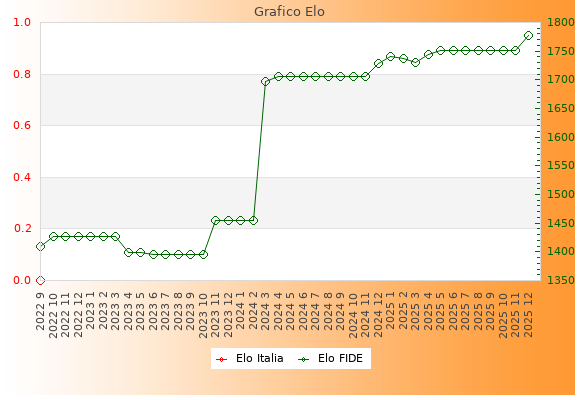 Elo FIDE: 1777    Migliore: 1777  (Dicembre 2025)    Peggiore: 1396  (Giugno 2023)