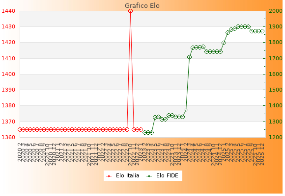 Elo FIDE: 1873    Migliore: 1902  (Agosto 2025)    Peggiore: 1231  (Marzo 2023)